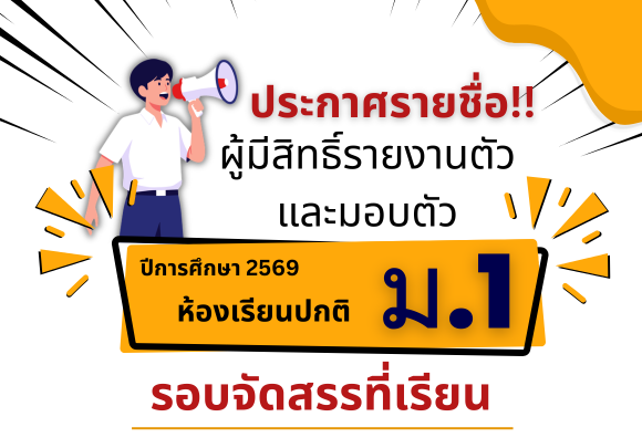 ประกาศรายชื่อผู้มีสิทธิ์รายงานตัวและมอบตัวเข้าเป็นนักเรียนชั้นมัธยมศึกษาปีที่ ๑ ปีการศึกษา ๒๕๖๙ ห้องเรียนปกติ รอบจัดสรรที่เรียน