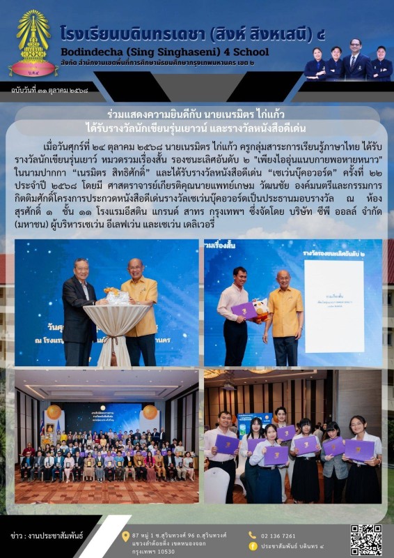 ร่วมแสดงความยินดีกับ นายเนรมิตร ไก่แก้ว ได้รับรางวัลนักเขียนรุ่นเยาวน์ และรางวัลหนังสือดีเด่น