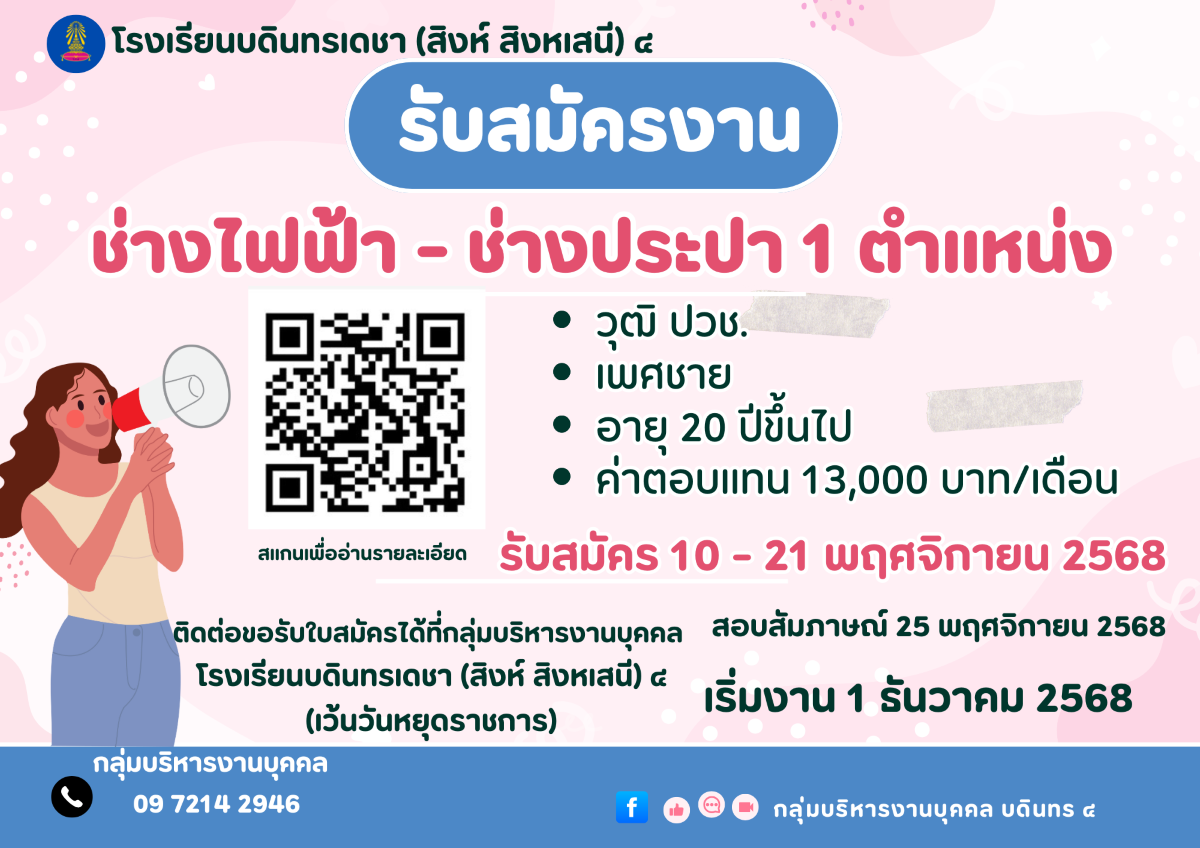 ประกาศรับสมัครพนักงานช่างไฟฟ้า -ประปา