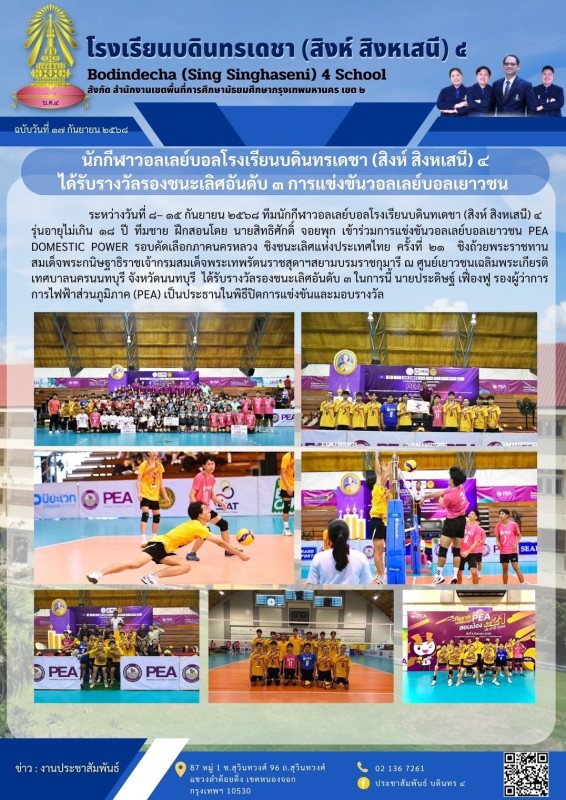 นักกีฬาวอลเลย์บอลโรงเรียนบดินทรเดชา (สิงห์ สิงหเสนี) ๔ ได้รับรางวัลรองชนะเลิศอันดับ ๓ การแข่งขันวอลเลย์บอลเยาวชน